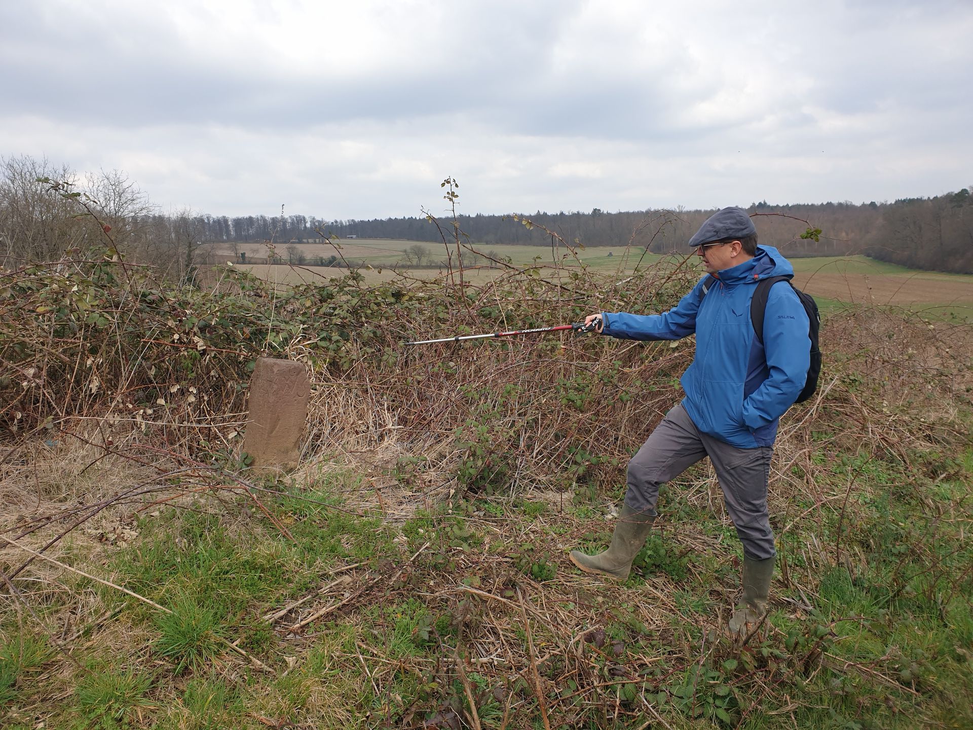 Dort, wo die Gemarkungen von Walzbachtal-Jöhlingen, Weingarten und Pfinztal-Berghausen aufeinanderstoßen, erreichten wir unser Ziel, den Dreimärkerstein.